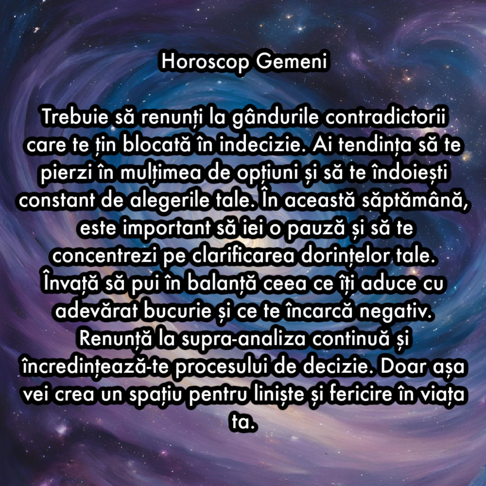 Trebuie să renunți la gândurile contradictorii care te țin blocată în indecizie. Ai tendința să te pierzi în mulțimea de opțiuni și să te îndoiești constant de alegerile tale. În această săptămână, este important să iei o pauză și să te concentrezi pe clarificarea dorințelor tale. Învață să pui în balanță ceea ce îți aduce cu adevărat bucurie și ce te încarcă negativ. Renunță la supra-analiza continuă și încredințează-te procesului de decizie. Doar așa vei crea un spațiu pentru liniște și fericire în viața ta.
