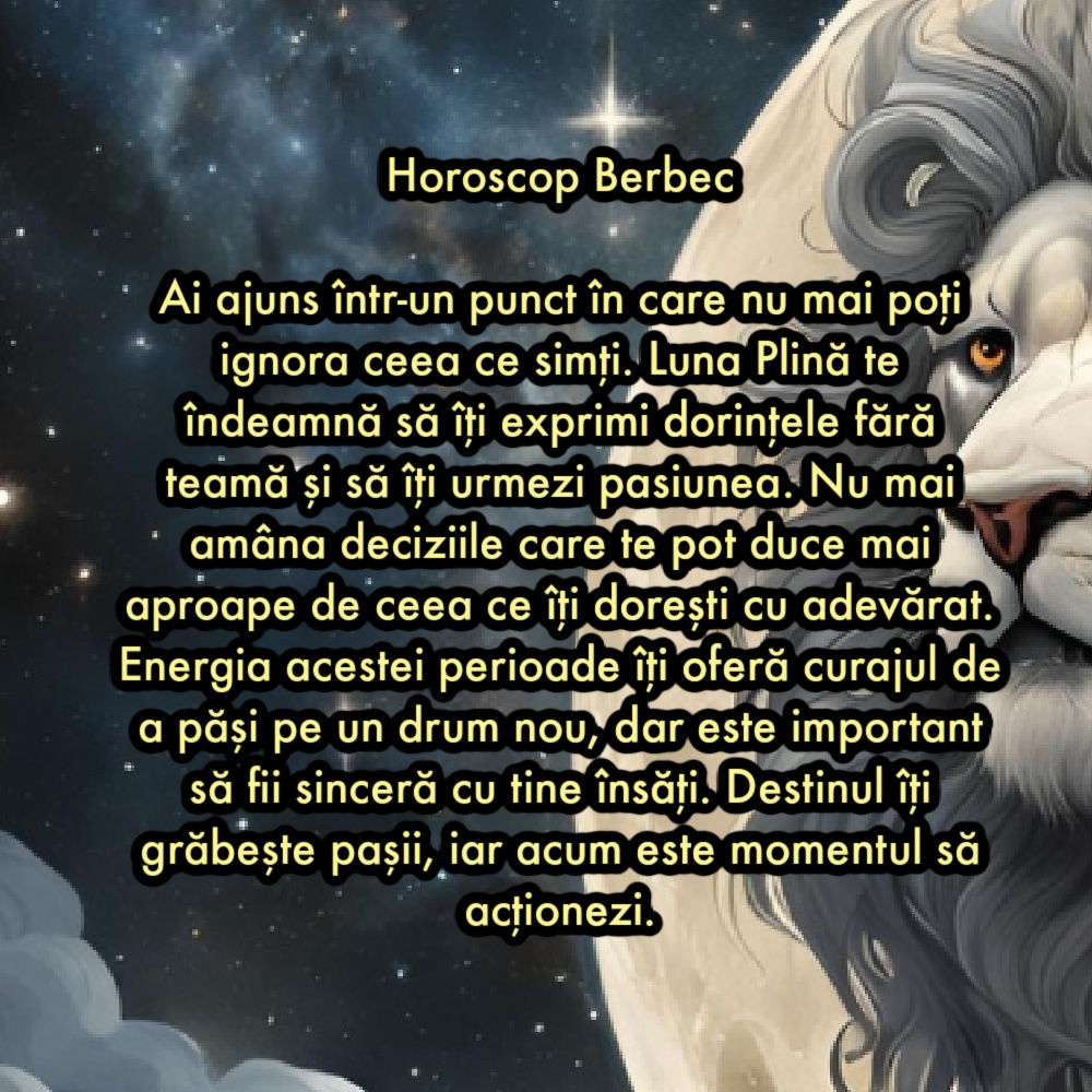 Ești în centrul atenției, iar această Lună Plină îți amplifică energia personală. Ai șansa să îți redefinești identitatea și să îți îmbrățișezi autenticitatea fără teamă. Dacă ai visat la o schimbare de imagine, de carieră sau de direcție de viață, acum este momentul potrivit să acționezi. Nu te teme să ieși în față și să îți asumi locul care îți aparține. Destinul îți deschide uși, dar doar dacă ai curajul să pășești prin ele.