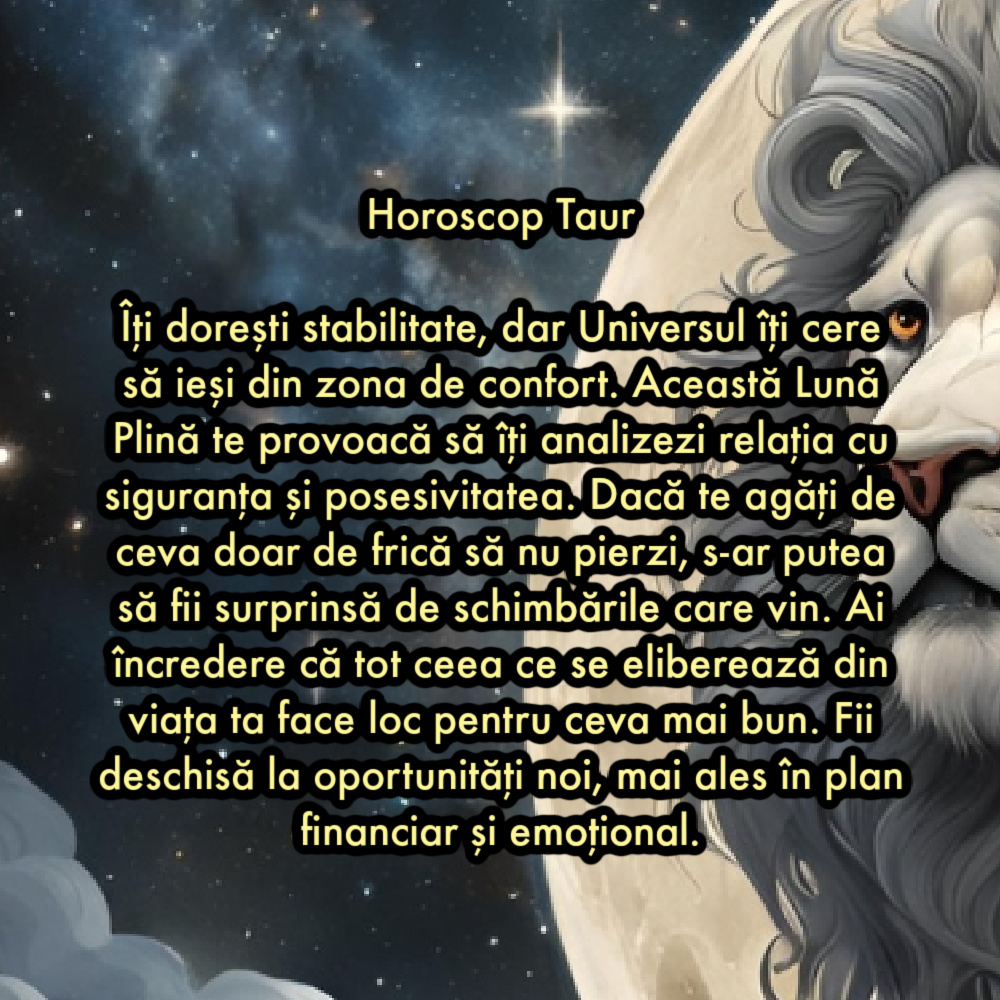 Îți dorești stabilitate, dar Universul îți cere să ieși din zona de confort. Această Lună Plină te provoacă să îți analizezi relația cu siguranța și posesivitatea. Dacă te agăți de ceva doar de frică să nu pierzi, s-ar putea să fii surprinsă de schimbările care vin. Ai încredere că tot ceea ce se eliberează din viața ta face loc pentru ceva mai bun. Fii deschisă la oportunități noi, mai ales în plan financiar și emoțional.