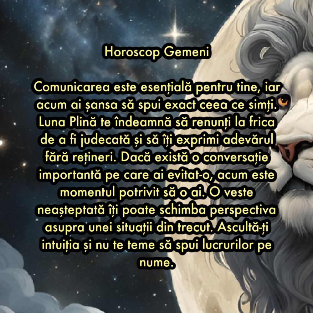 Comunicarea este esențială pentru tine, iar acum ai șansa să spui exact ceea ce simți. Luna Plină te îndeamnă să renunți la frica de a fi judecată și să îți exprimi adevărul fără rețineri. Dacă există o conversație importantă pe care ai evitat-o, acum este momentul potrivit să o ai. O veste neașteptată îți poate schimba perspectiva asupra unei situații din trecut. Ascultă-ți intuiția și nu te teme să spui lucrurilor pe nume.