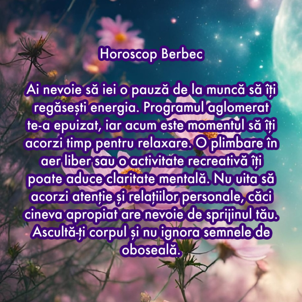 Ai nevoie să iei o pauză de la muncă să îți regăsești energia. Programul aglomerat te-a epuizat, iar acum este momentul să îți acorzi timp pentru relaxare. O plimbare în aer liber sau o activitate recreativă îți poate aduce claritate mentală. Nu uita să acorzi atenție și relațiilor personale, căci cineva apropiat are nevoie de sprijinul tău. Ascultă-ți corpul și nu ignora semnele de oboseală.