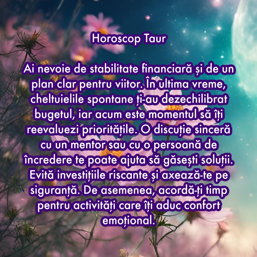 Ai nevoie de stabilitate financiară și de un plan clar pentru viitor. În ultima vreme, cheltuielile spontane ți-au dezechilibrat bugetul, iar acum este momentul să îți reevaluezi prioritățile. O discuție sinceră cu un mentor sau cu o persoană de încredere te poate ajuta să găsești soluții. Evită investițiile riscante și axează-te pe siguranță. De asemenea, acordă-ți timp pentru activități care îți aduc confort emoțional.