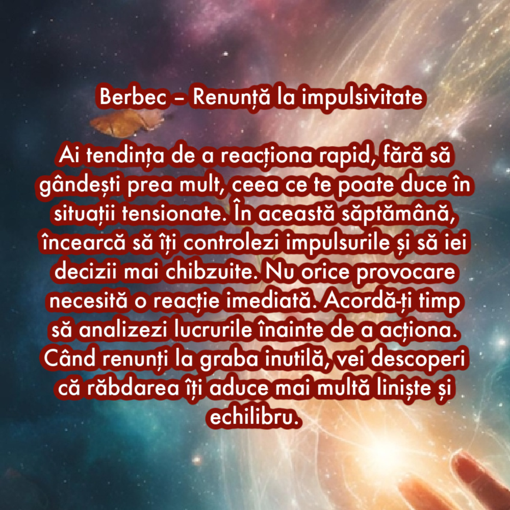 Ai tendința de a reacționa rapid, fără să gândești prea mult, ceea ce te poate duce în situații tensionate. În această săptămână, încearcă să îți controlezi impulsurile și să iei decizii mai chibzuite. Nu orice provocare necesită o reacție imediată. Acordă-ți timp să analizezi lucrurile înainte de a acționa. Când renunți la graba inutilă, vei descoperi că răbdarea îți aduce mai multă liniște și echilibru.