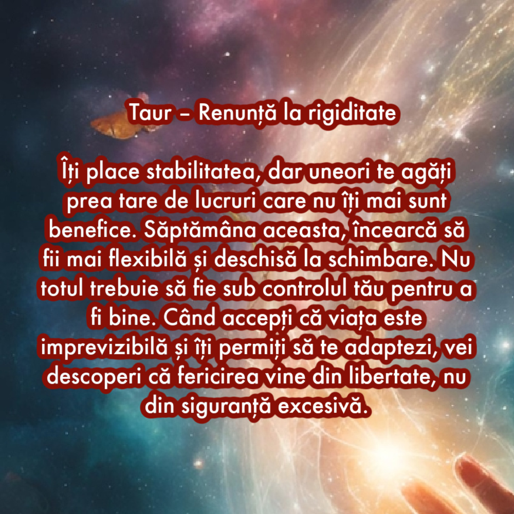 Îți place stabilitatea, dar uneori te agăți prea tare de lucruri care nu îți mai sunt benefice. Săptămâna aceasta, încearcă să fii mai flexibilă și deschisă la schimbare. Nu totul trebuie să fie sub controlul tău pentru a fi bine. Când accepți că viața este imprevizibilă și îți permiți să te adaptezi, vei descoperi că fericirea vine din libertate, nu din siguranță excesivă.