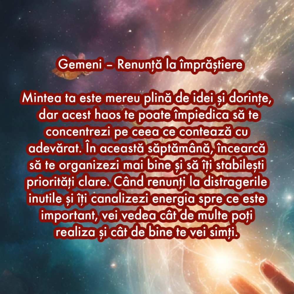 Mintea ta este mereu plină de idei și dorințe, dar acest haos te poate împiedica să te concentrezi pe ceea ce contează cu adevărat. În această săptămână, încearcă să te organizezi mai bine și să îți stabilești priorități clare. Când renunți la distragerile inutile și îți canalizezi energia spre ce este important, vei vedea cât de multe poți realiza și cât de bine te vei simți.
