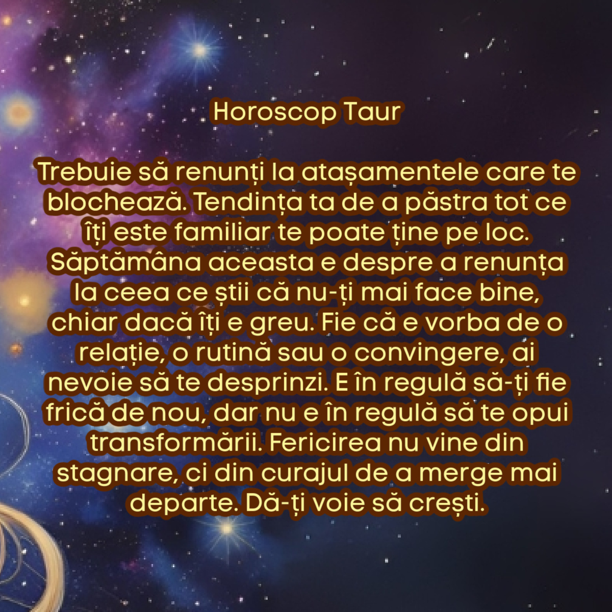 Trebuie să renunți la atașamentele care te blochează. Tendința ta de a păstra tot ce îți este familiar te poate ține pe loc. Săptămâna aceasta e despre a renunța la ceea ce știi că nu-ți mai face bine, chiar dacă îți e greu. Fie că e vorba de o relație, o rutină sau o convingere, ai nevoie să te desprinzi. E în regulă să-ți fie frică de nou, dar nu e în regulă să te opui transformării. Fericirea nu vine din stagnare, ci din curajul de a merge mai departe. Dă-ți voie să crești.