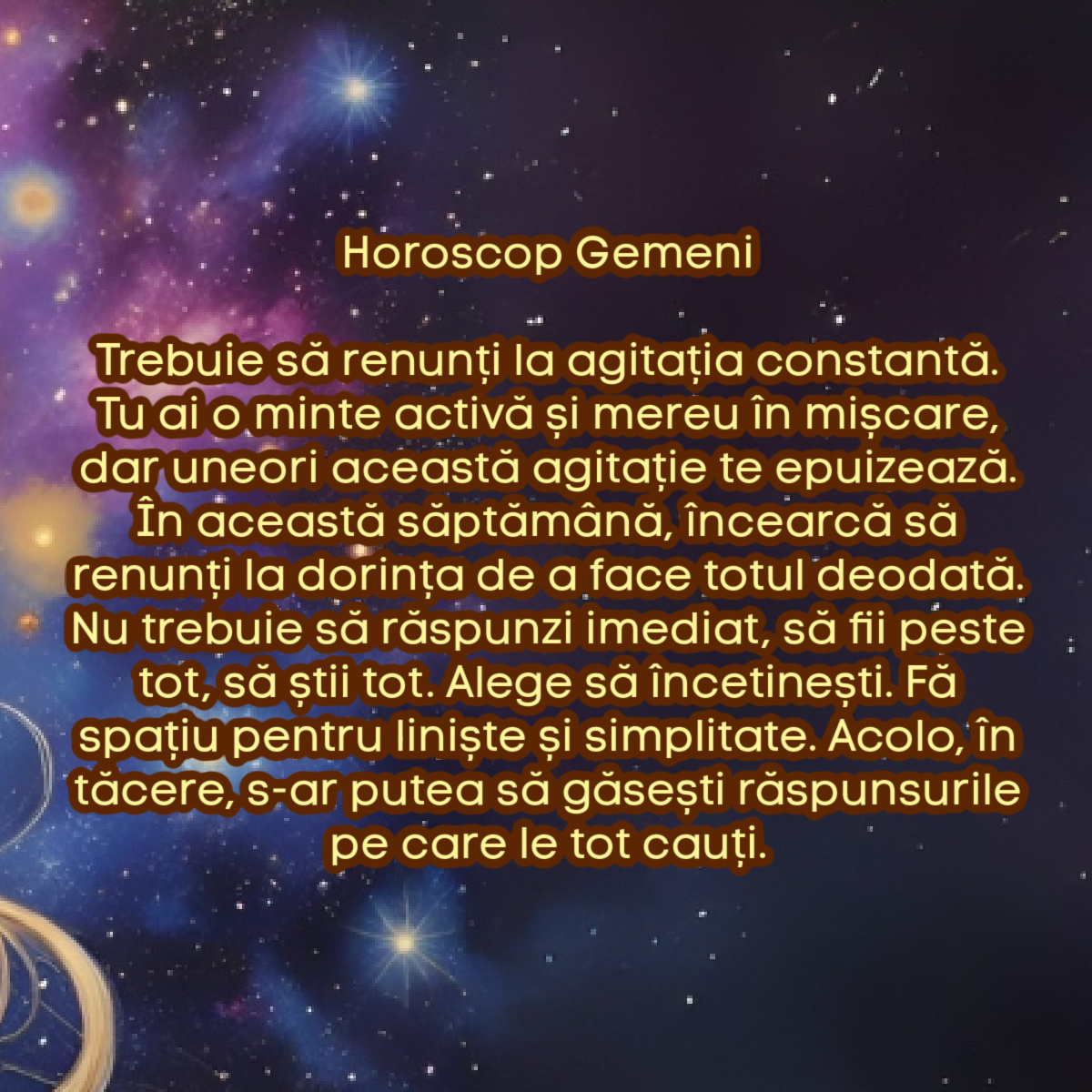 Trebuie să renunți la agitația constantă. Tu ai o minte activă și mereu în mișcare, dar uneori această agitație te epuizează. În această săptămână, încearcă să renunți la dorința de a face totul deodată. Nu trebuie să răspunzi imediat, să fii peste tot, să știi tot. Alege să încetinești. Fă spațiu pentru liniște și simplitate. Acolo, în tăcere, s-ar putea să găsești răspunsurile pe care le tot cauți.