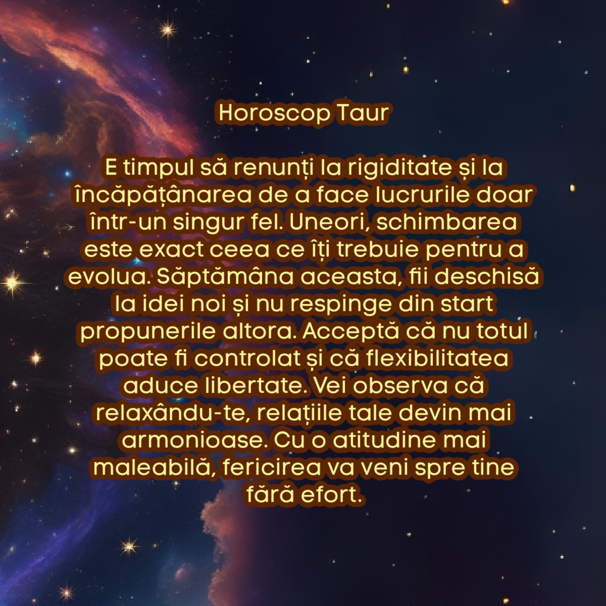 E timpul să renunți la rigiditate și la încăpățânarea de a face lucrurile doar într-un singur fel. Uneori, schimbarea este exact ceea ce îți trebuie pentru a evolua. Săptămâna aceasta, fii deschisă la idei noi și nu respinge din start propunerile altora. Acceptă că nu totul poate fi controlat și că flexibilitatea aduce libertate. Vei observa că relaxându-te, relațiile tale devin mai armonioase. Cu o atitudine mai maleabilă, fericirea va veni spre tine fără efort.