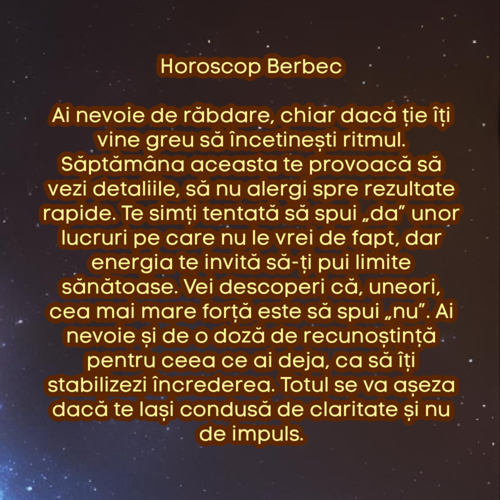 Ai nevoie de răbdare, chiar dacă ție îți vine greu să încetinești ritmul. Săptămâna aceasta te provoacă să vezi detaliile, să nu alergi spre rezultate rapide. Te simți tentată să spui „da” unor lucruri pe care nu le vrei de fapt, dar energia te invită să-ți pui limite sănătoase. Vei descoperi că, uneori, cea mai mare forță este să spui „nu”. Ai nevoie și de o doză de recunoștință pentru ceea ce ai deja, ca să îți stabilizezi încrederea. Totul se va așeza dacă te lași condusă de claritate și nu de impuls.