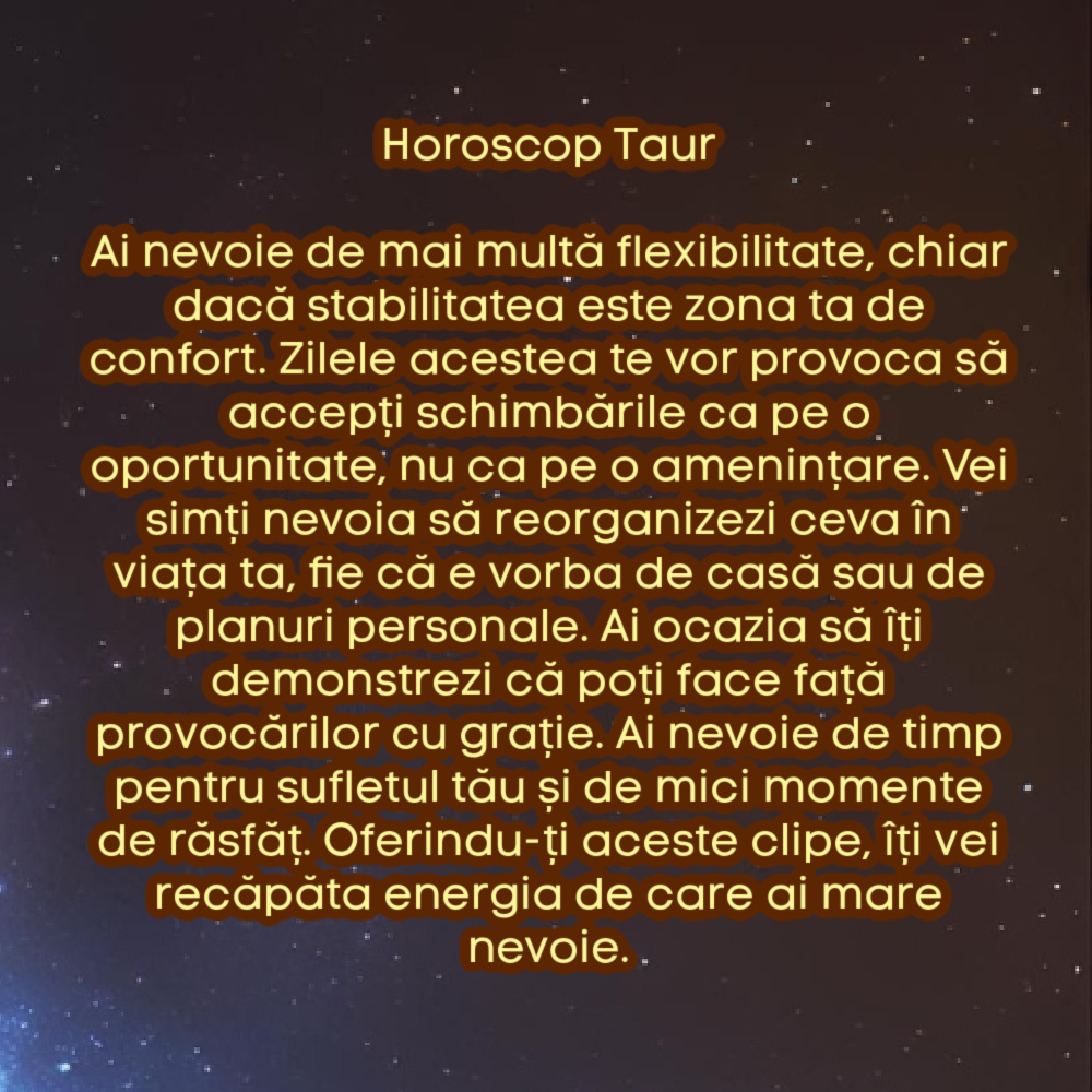 Ai nevoie de mai multă flexibilitate, chiar dacă stabilitatea este zona ta de confort. Zilele acestea te vor provoca să accepți schimbările ca pe o oportunitate, nu ca pe o amenințare. Vei simți nevoia să reorganizezi ceva în viața ta, fie că e vorba de casă sau de planuri personale. Ai ocazia să îți demonstrezi că poți face față provocărilor cu grație. Ai nevoie de timp pentru sufletul tău și de mici momente de răsfăț. Oferindu-ți aceste clipe, îți vei recăpăta energia de care ai mare nevoie.