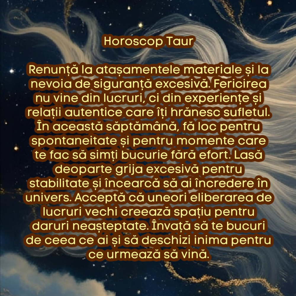 Renunță la frica de necunoscut și la așteptările nerealiste. În această săptămână, bucuria apare atunci când accepți că viața nu poate fi controlată complet și că unele lucruri trebuie lăsate să se desfășoare natural. Fă un pas înapoi și privește situațiile cu detașare, în loc să le forțezi să se potrivească planurilor tale. Eliberează-te de stresul legat de rezultate și de presiunea auto-impusă. Încrederea că totul se va așeza la momentul potrivit îți va aduce liniște și pace interioară. Această flexibilitate te va ajuta să atragi oportunități neașteptate și experiențe care îți hrănesc sufletul.