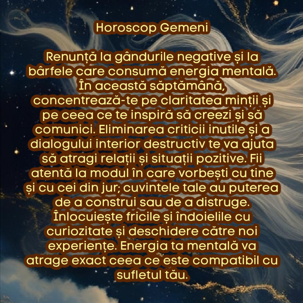 Renunță la gândurile negative și la bârfele care consumă energia mentală. În această săptămână, concentrează-te pe claritatea minții și pe ceea ce te inspiră să creezi și să comunici. Eliminarea criticii inutile și a dialogului interior destructiv te va ajuta să atragi relații și situații pozitive. Fii atentă la modul în care vorbești cu tine și cu cei din jur; cuvintele tale au puterea de a construi sau de a distruge. Înlocuiește fricile și îndoielile cu curiozitate și deschidere către noi experiențe. Energia ta mentală va atrage exact ceea ce este compatibil cu sufletul tău.
