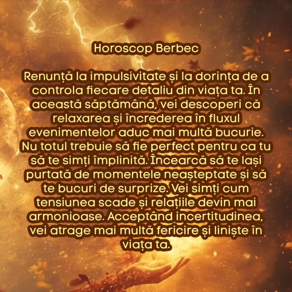 Renunță la impulsivitate și la dorința de a controla fiecare detaliu din viața ta. În această săptămână, vei descoperi că relaxarea și încrederea în fluxul evenimentelor aduc mai multă bucurie. Nu totul trebuie să fie perfect pentru ca tu să te simți împlinită. Încearcă să te lași purtată de momentele neașteptate și să te bucuri de surprize. Vei simți cum tensiunea scade și relațiile devin mai armonioase. Acceptând incertitudinea, vei atrage mai multă fericire și liniște în viața ta.