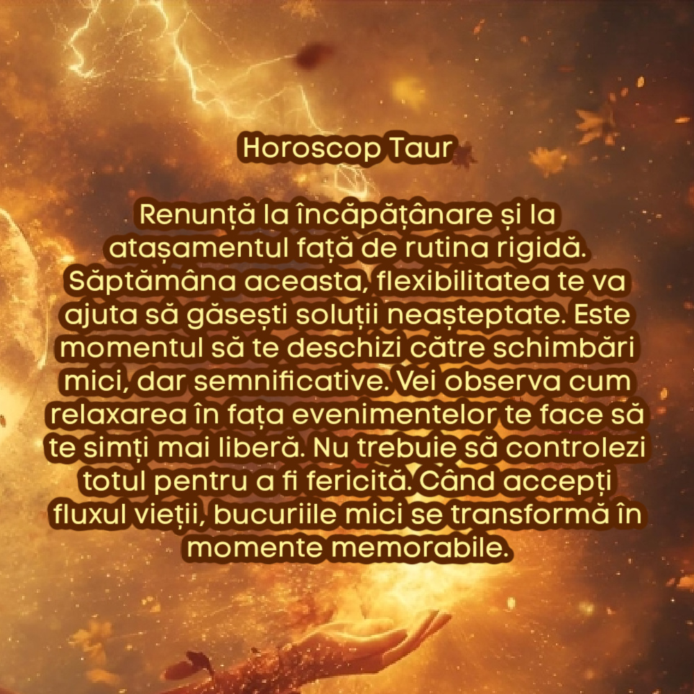 Renunță la încăpățânare și la atașamentul față de rutina rigidă. Săptămâna aceasta, flexibilitatea te va ajuta să găsești soluții neașteptate. Este momentul să te deschizi către schimbări mici, dar semnificative. Vei observa cum relaxarea în fața evenimentelor te face să te simți mai liberă. Nu trebuie să controlezi totul pentru a fi fericită. Când accepți fluxul vieții, bucuriile mici se transformă în momente memorabile.