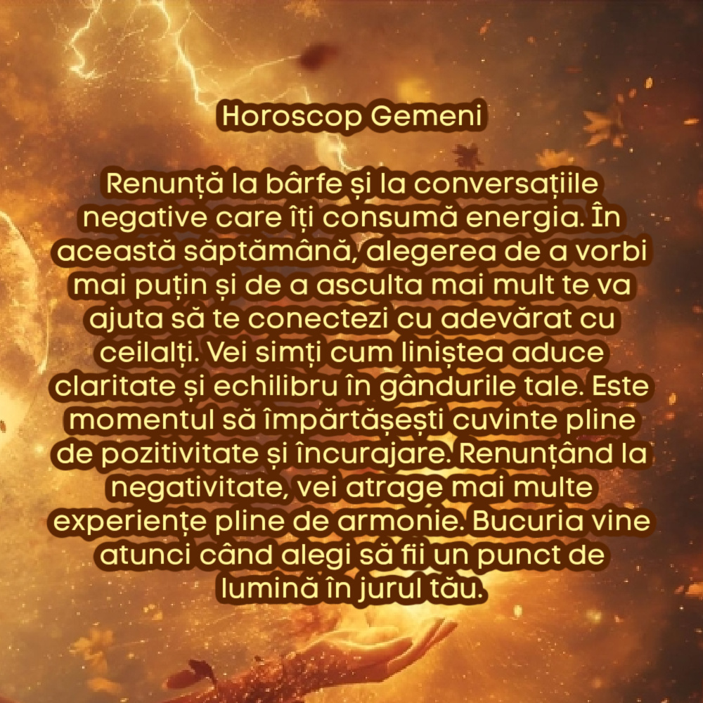 Renunță la bârfe și la conversațiile negative care îți consumă energia. În această săptămână, alegerea de a vorbi mai puțin și de a asculta mai mult te va ajuta să te conectezi cu adevărat cu ceilalți. Vei simți cum liniștea aduce claritate și echilibru în gândurile tale. Este momentul să împărtășești cuvinte pline de pozitivitate și încurajare. Renunțând la negativitate, vei atrage mai multe experiențe pline de armonie. Bucuria vine atunci când alegi să fii un punct de lumină în jurul tău.