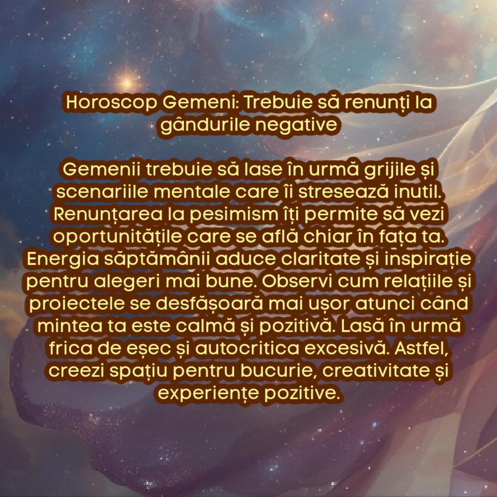 Gemenii trebuie să lase în urmă grijile și scenariile mentale care îi stresează inutil. Renunțarea la pesimism îți permite să vezi oportunitățile care se află chiar în fața ta. Energia săptămânii aduce claritate și inspirație pentru alegeri mai bune. Observi cum relațiile și proiectele se desfășoară mai ușor atunci când mintea ta este calmă și pozitivă. Lasă în urmă frica de eșec și autocritica excesivă. Astfel, creezi spațiu pentru bucurie, creativitate și experiențe pozitive.