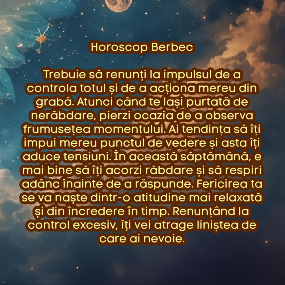 Trebuie să renunți la impulsul de a controla totul și de a acționa mereu din grabă. Atunci când te lași purtată de nerăbdare, pierzi ocazia de a observa frumusețea momentului. Ai tendința să îți impui mereu punctul de vedere și asta îți aduce tensiuni. În această săptămână, e mai bine să îți acorzi răbdare și să respiri adânc înainte de a răspunde. Fericirea ta se va naște dintr-o atitudine mai relaxată și din încredere în timp. Renunțând la control excesiv, îți vei atrage liniștea de care ai nevoie.