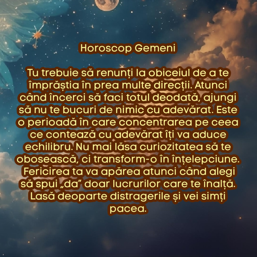 Tu trebuie să renunți la obiceiul de a te împrăștia în prea multe direcții. Atunci când încerci să faci totul deodată, ajungi să nu te bucuri de nimic cu adevărat. Este o perioadă în care concentrarea pe ceea ce contează cu adevărat îți va aduce echilibru. Nu mai lăsa curiozitatea să te obosească, ci transform-o în înțelepciune. Fericirea ta va apărea atunci când alegi să spui „da” doar lucrurilor care te înalță. Lasă deoparte distragerile și vei simți pacea.