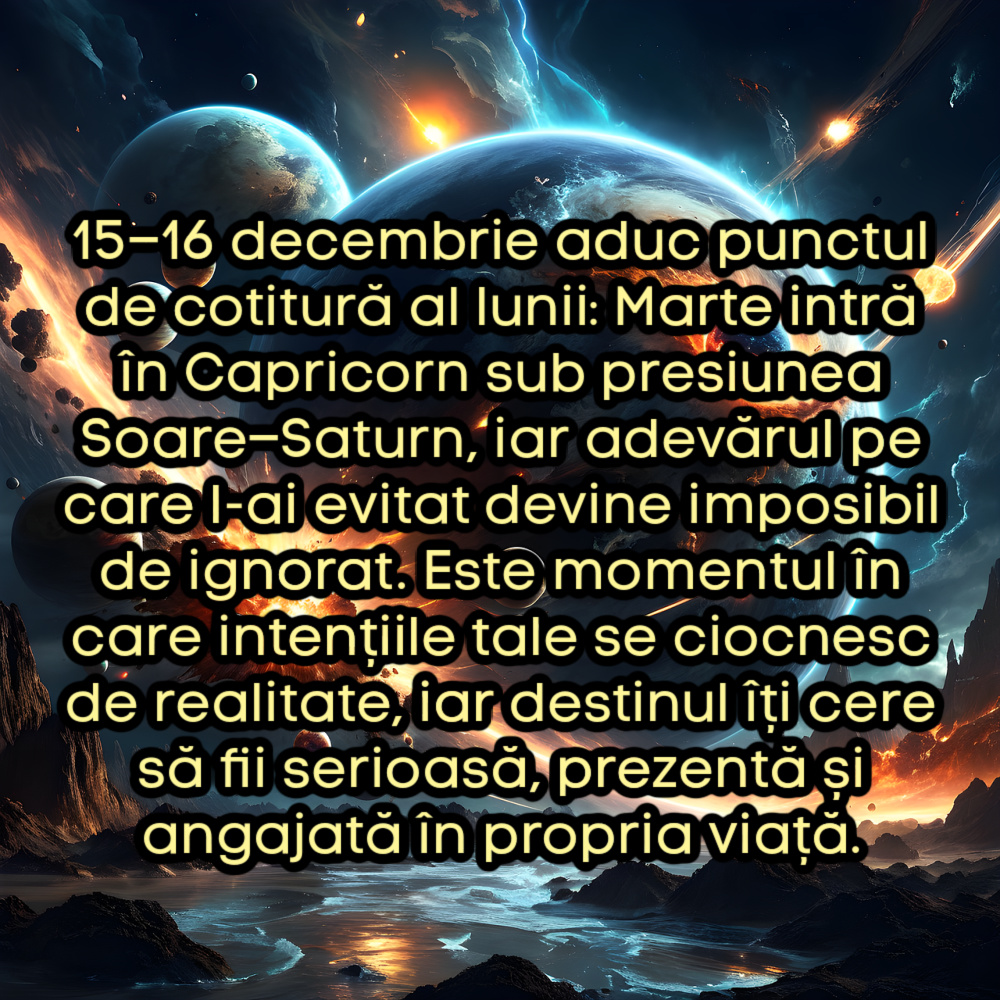 15–16 decembrie aduc punctul de cotitură al lunii: Marte intră în Capricorn sub presiunea Soare–Saturn, iar adevărul pe care l-ai evitat devine imposibil de ignorat. Este momentul în care intențiile tale se ciocnesc de realitate, iar destinul îți cere să fii serioasă, prezentă și angajată în propria viață.