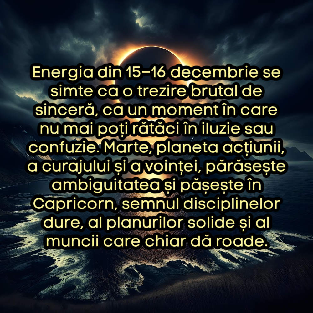 Energia din 15–16 decembrie se simte ca o trezire brutal de sinceră, ca un moment în care nu mai poți rătăci în iluzie sau confuzie. Marte, planeta acțiunii, a curajului și a voinței, părăsește ambiguitatea și pășește în Capricorn, semnul disciplinelor dure, al planurilor solide și al muncii care chiar dă roade. Până să ajungă acolo, însă, se ciocnește de Neptun, iar acest aspect scoate la lumină toate presupunerile greșite, fanteziile emoționale sau strategiile care nu aveau o fundație reală. E ca și cum universul stinge lumina roz și aprinde reflectorul adevărului. Și odată ce vezi ce e real, nu mai poți întoarce privirea.