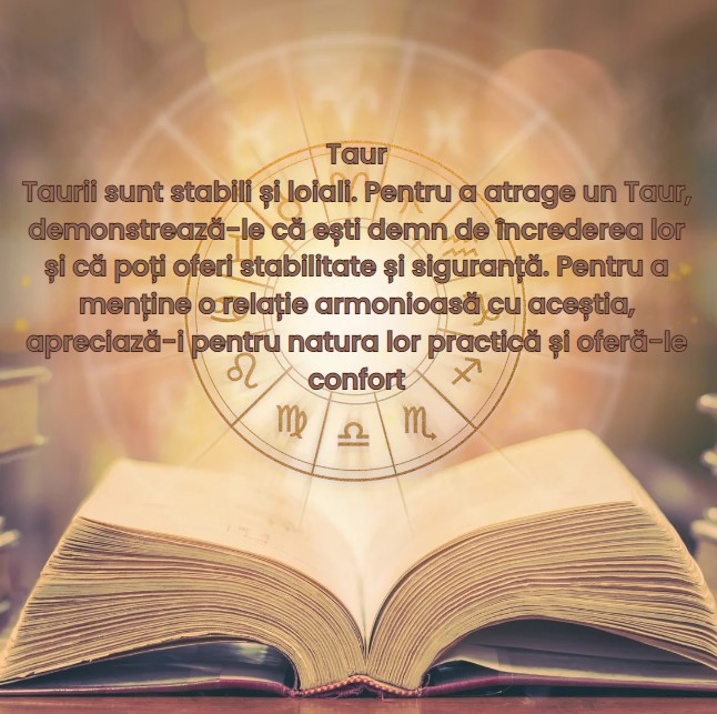 Taurii sunt stabili și loiali. Pentru a atrage un Taur, demonstrează-le că ești demn de încrederea lor și că poți oferi stabilitate și siguranță. Pentru a menține o relație armonioasă cu aceștia, apreciază-i pentru natura lor practică și oferă-le confort.