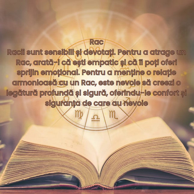 Racii sunt sensibili și devotați. Pentru a atrage un Rac, arată-i că ești empatic și că îi poți oferi sprijin emoțional. Pentru a menține o relație armonioasă cu un Rac, este nevoie să creezi o legătură profundă și sigură, oferindu-le confort și siguranța de care au nevoie.