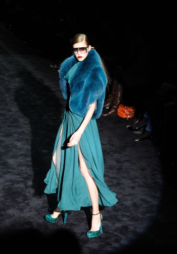Colectia a debutat cu tinute dandy si rochii seducatoare accesorizate cu blanuri de lux. Gucci recreeaza imaginea femeii de alta data: eleganta, cu o atitudine sobra si totodata seducatoare. Frida Giannini, directorul de creatie al casei de moda propune rochii lungi cu taieturi indraznete care dezgolesc picioarele. Foto: Copyright Xinhua News Agency / Northfoto