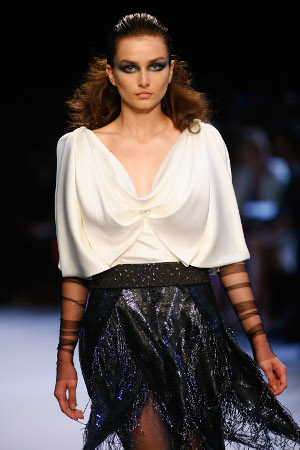 Colectia de toamna iarna 2009-2010 semnata de Georges Chakra este inspirata de moda anilor ’20. Vom intalni asadar franjuri, margele, pene, paiete dispuse pe rochia in stil flapper si cardiganuri. Photo by Julien Hekimian/Getty Images for Georges Chakra