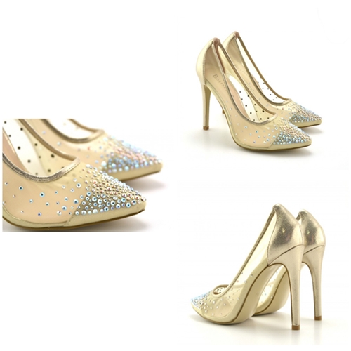 Pantofii de dama aurii ,cu toc de 10 cm, material foarte fin, translucid si strasuri fin aplicate sunt solutia eleganta pentru o tinuta de seara sofisticata.