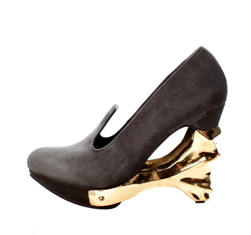 Avand ca inspiratie initiala decoratiunile baroce, dar si modalitatea de figurare a miscarii din sculptura futurista, acest toc personalizat a fost realizat cu indrumarea si sprijinul lui Aurel Ierulescu, un renumit sculptor roman. Obiectul care acopera tocul este realizat din cupru acoperit galvanic cu nichel negru sau aur, in functie de necesitatile de decorare. Aceasta carcasa metalica ce imbraca tocul si este fixata pe platou creeaza o platforma aparenta, oferind pantofului o alta valoare estetica. Volumul acestor platforme metalice, intens vibrat, sugereaza miscarea, viteza, acceleratia, asociatii firesti cu zona de incaltaminte.