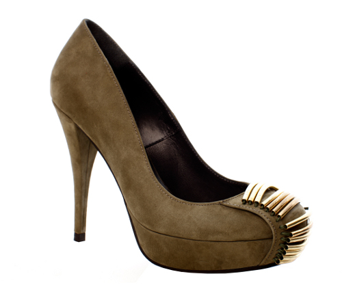 Avand ca inspiratie initiala decoratiunile baroce, dar si modalitatea de figurare a miscarii din sculptura futurista, acest toc personalizat a fost realizat cu indrumarea si sprijinul lui Aurel Ierulescu, un renumit sculptor roman. Obiectul care acopera tocul este realizat din cupru acoperit galvanic cu nichel negru sau aur, in functie de necesitatile de decorare. Aceasta carcasa metalica ce imbraca tocul si este fixata pe platou creeaza o platforma aparenta, oferind pantofului o alta valoare estetica. Volumul acestor platforme metalice, intens vibrat, sugereaza miscarea, viteza, acceleratia, asociatii firesti cu zona de incaltaminte.