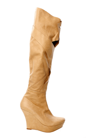 Avand ca inspiratie initiala decoratiunile baroce, dar si modalitatea de figurare a miscarii din sculptura futurista, acest toc personalizat a fost realizat cu indrumarea si sprijinul lui Aurel Ierulescu, un renumit sculptor roman. Obiectul care acopera tocul este realizat din cupru acoperit galvanic cu nichel negru sau aur, in functie de necesitatile de decorare. Aceasta carcasa metalica ce imbraca tocul si este fixata pe platou creeaza o platforma aparenta, oferind pantofului o alta valoare estetica. Volumul acestor platforme metalice, intens vibrat, sugereaza miscarea, viteza, acceleratia, asociatii firesti cu zona de incaltaminte.