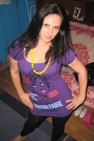 Claudia ne-a atras atentia pentru ca poarta o bluza "kudika-mov", asortata cu margele galbene, o combinatie curajoasa si reusita.