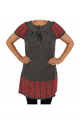Rochie tricotata stil tunica cu guler rotund si snur, maneca scurta si lungime 77 cm.