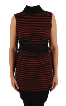 Rochie tricotata cu dungi orizontale rosii si negre. Este cu guler inalt, cambrata pe corp si fara maneci.