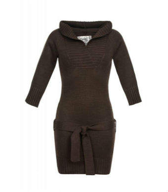 Rochie tricotata groasa, cu maneca lunga si gluga, maro din 100% acryl.