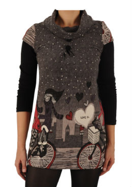Rochie tunica tricotata cu guler dublat, manecile sunt din material uni iar corpul este imprimat. Lungime cca. 76 cm.