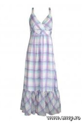 15. Rochie in carouriRochie cu bretele din panza de bumbac, captusita; bustul este format din doua piese petrecute, cu cret la baza si joc de caro. Rochia se strange sub bust cu o banda bordata cu impletitura si cordoane. Este disponibila la Tara Fashion, pret 159.90 lei.