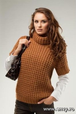 Un pulover cu maneci scurte este perfect pentru o zi la birou. Se poarta simplu sau suprapus peste o camasa alba. Propunere: pulover cu model popcorn