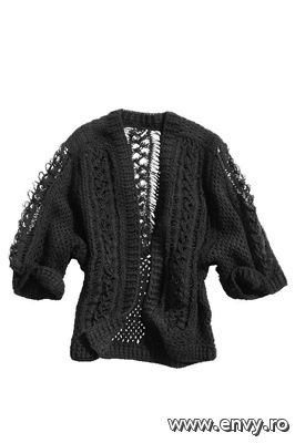 Cardiganul este tricotat cu modele etnice de baza. Seara se poarta cu o centura lata in talie si coliere suprapuse. Este disponibil in magazinele H&M la pretul de 279 lei.