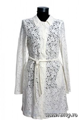 3. Trench alb din dantelaAdauga rafinament unei tinute office sau casual cu un trench feminin din dantela. Se inchide cu nasturi si se leaga cu un cordon in talie. Poarta-l peste o rochie neagra, simpla ori peste o tinuta nude.