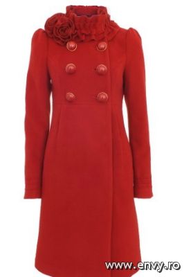 4. Redingota rosieRedingota confectionata din stofa cu lana de lungime medie, decorata cu volane si nasturi rotunzi.