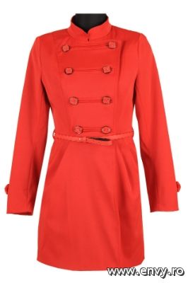 5. Trench rosu Trench de dama cu guler tunica la doua randuri de nasturi. In talie are o taietura cu pense si curea.