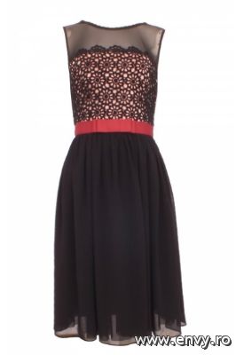Rochie ampla din voal cu bustul de dantela si tull negru elastic. Are talia accentuata cu banda ripsata, decorata cu o funda; este disponibila in magazinele 24shop.ro, pret 499. lei