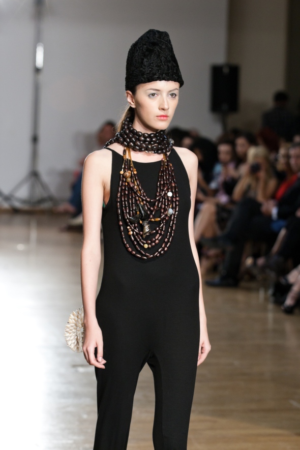 In viziunea designerului, viitorul prezent - estetic - extatic inseamna: alb/negru, volume suprapuse de inspiratie maramuresana, pliseuri, alternanta stofa de lana/material tehnologic, jersey, piele, portelan. Detaliile hainelor suplinesc lipsa bijuteriilor ca obiecte separate, prin aplicatiile de portelan, haina insasi devine bijuterie.