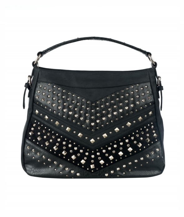 Geanta din piele neagra cu tinte este o propunere indrazneata pentru noul sezon.