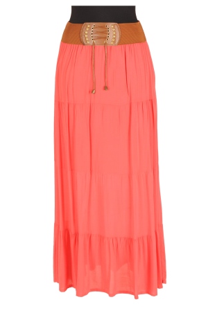 Materialul fustei este usor sifonat si cusut in patru volane. Pe primul volan are aplicat dantela. In talie are o banda lata elastica cu un siret decorativ pe fata. Modelul este lejer, intr-o nuanta puternica de vara pentru o zi superba de vacanta. Lungime 96 cm.