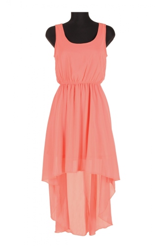 Rochie voal corai, model prevazut cu captuseala. Decolteu rotunjit, partea de jos este scurta pe fata avand o lungime de 74 cm si mai lunga in spate ca o coada randunica si are lungimea de 132 cm de la mijloc gat pana la cel mai lung punct. La Femme a anticipat aceste tendinte de culori vii si iti propune modele foarte interesante in noua colectie primavara vara 2012. Compozitie: 100% poliester