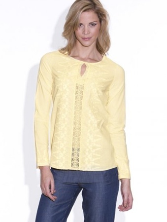 Bluza galben pal cu decolteu rotund prins cu nasture si cu broderie pe piept.