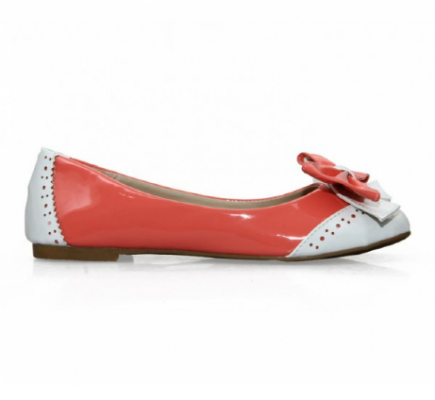 Balerini lacuiti cu funda aplicata, in alb si corai. Usor de combinat cu pantaloni, fuste si rochii albe din materiale usoare, foarte purtate in sezonul cald.
